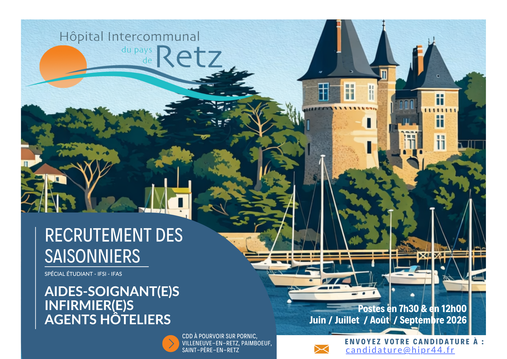 Les candidatures sont à adresser avant le lundi 14 avril 2025 inclus (le cachet de la poste faisant foi) à : Madame la Directrice des Ressources Humaines Hôpital Intercommunal du Pays de Retz Route de Nantes – ZA la Chaussée CS 91309 44213 PORNIC CEDEX