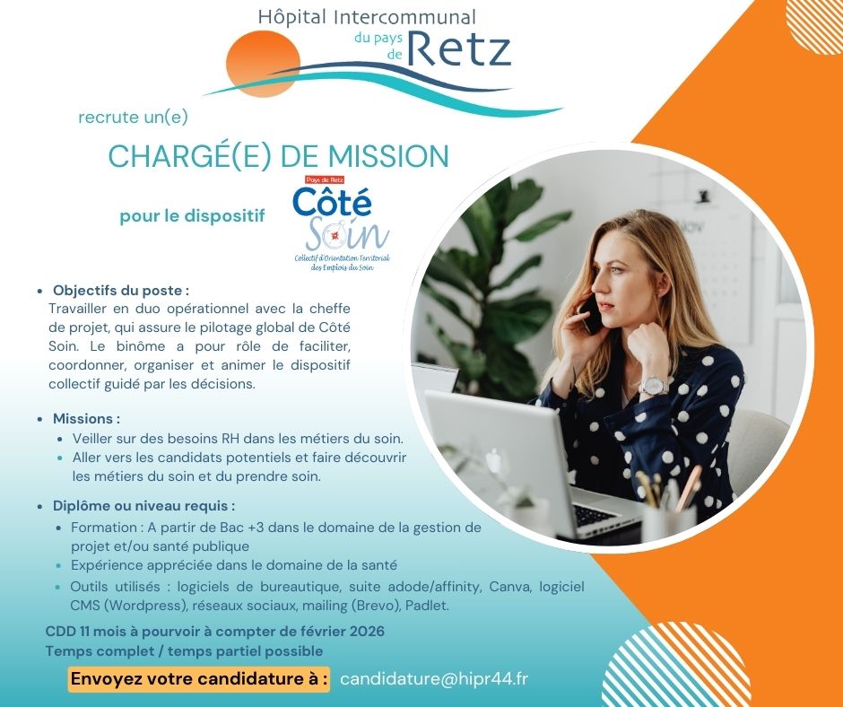 L'HOPITAL INTERCOMMUNAL DU PAYS DE RETZ (HIPR) recrute un(e) chargé(e) de mission pour le dispositif "Côté Soin"